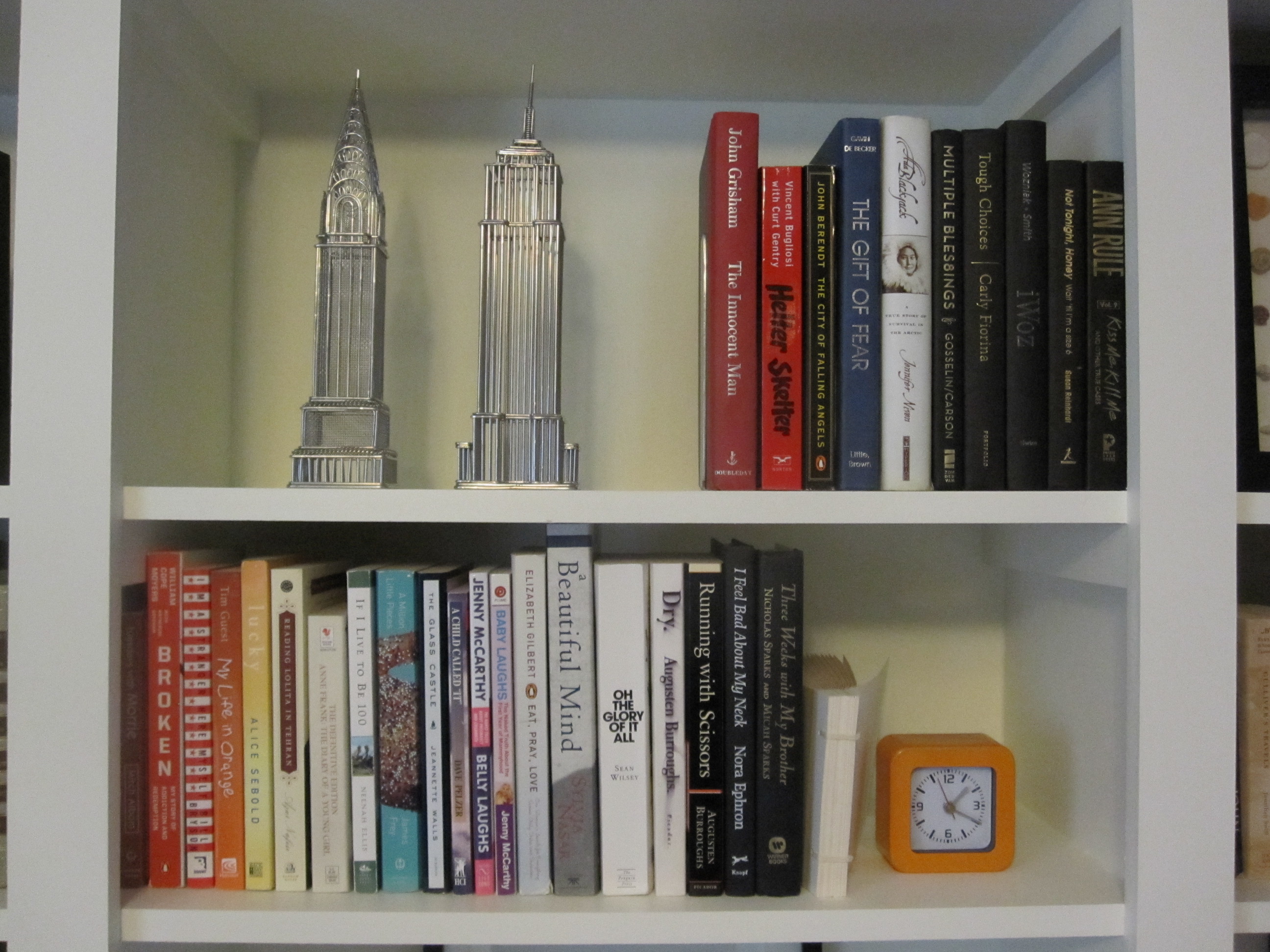 3. After grouping, I arranged the books in rainbow order. Red through purple first, then white, grey, black and brown. A group of red books is the beginning of a new group. Not exactly a science, but it works for me.