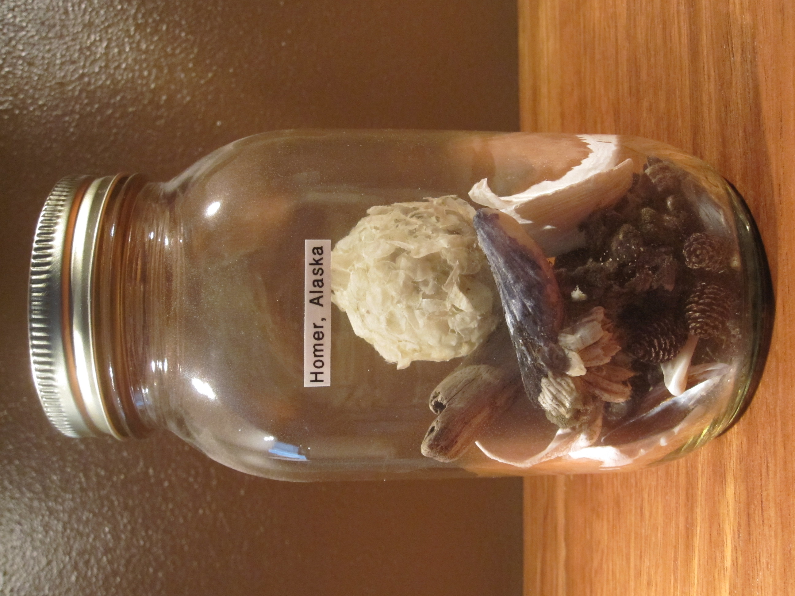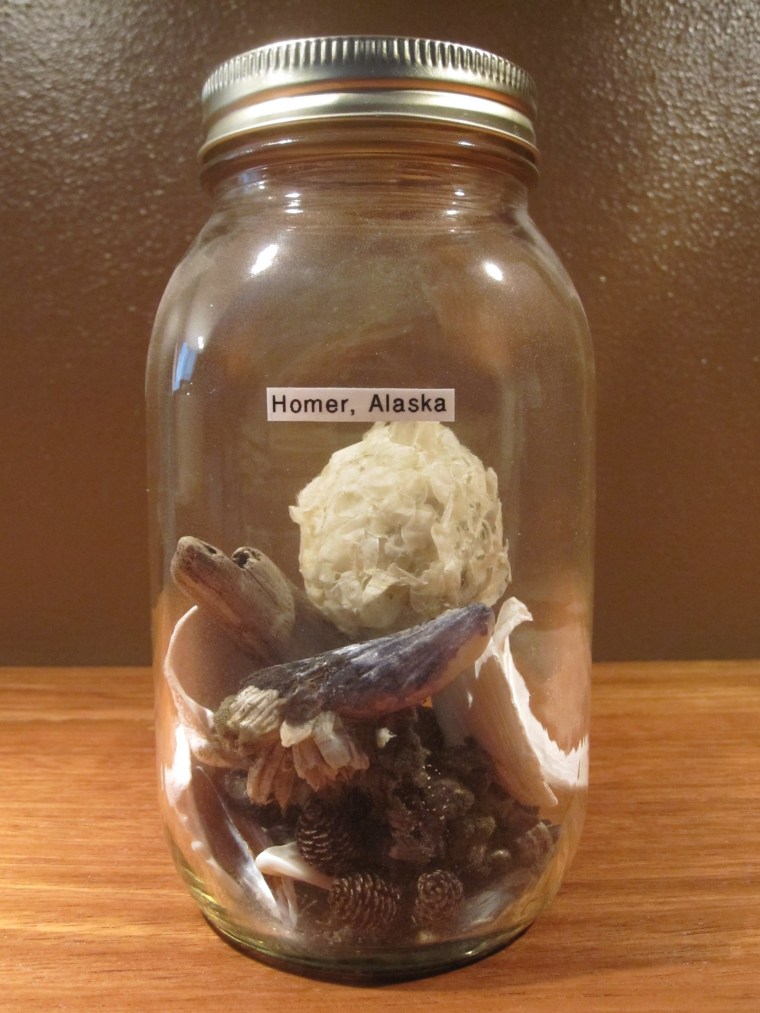 I have a vacation shelf in my office complete with vacation jars and books. I try to buy a book from all of our vacation spots, just to show some photos to people and remember where we were. Some of the items I have from our vacations are too big for the jars (like a map from Savannah and a booklet from our Alaskan boat tour) so those are to the side.