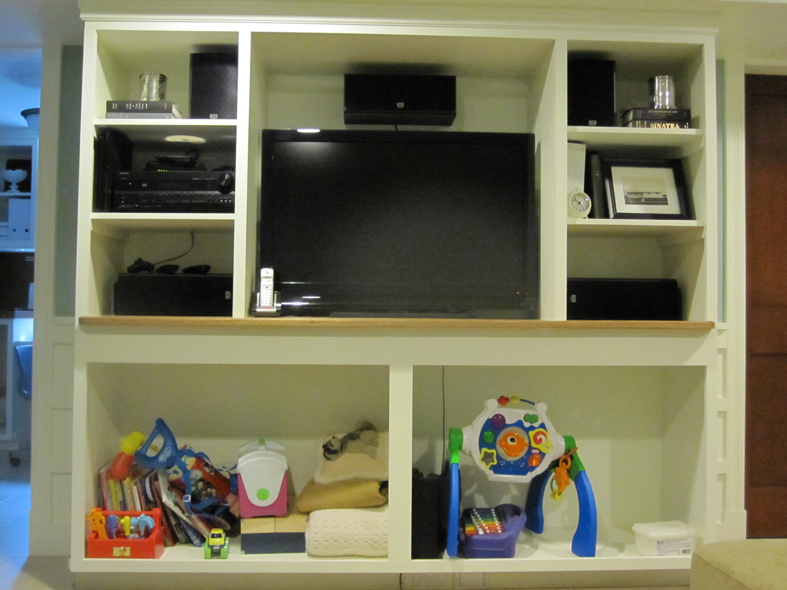 We have some finishing to do, like build, prime and paint our sliding entertainment center doors to hide the ugly toys, add shelving and make some pretty storage for DVDs, but all in good time.