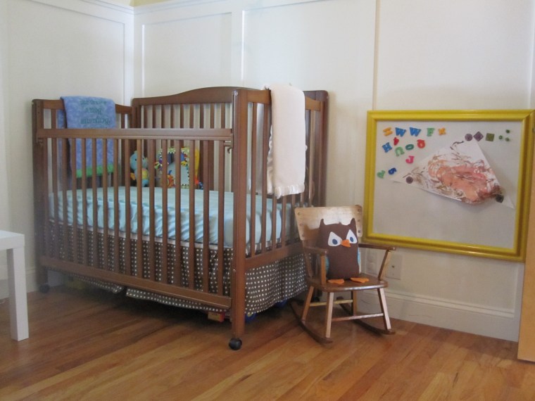 Before I had my office in the basement, I was using our little desk upstairs to run my stationery shop.  I used this board to keep papers and track my current orders.  Now that I have a magnetic backsplash, Vincent needs this board more than I do.  He has been using the side of the refrigerator to play with his alphabet letters, but many of the letters get kicked under.  Enter, the new magnet board.  Here it was before I painted.