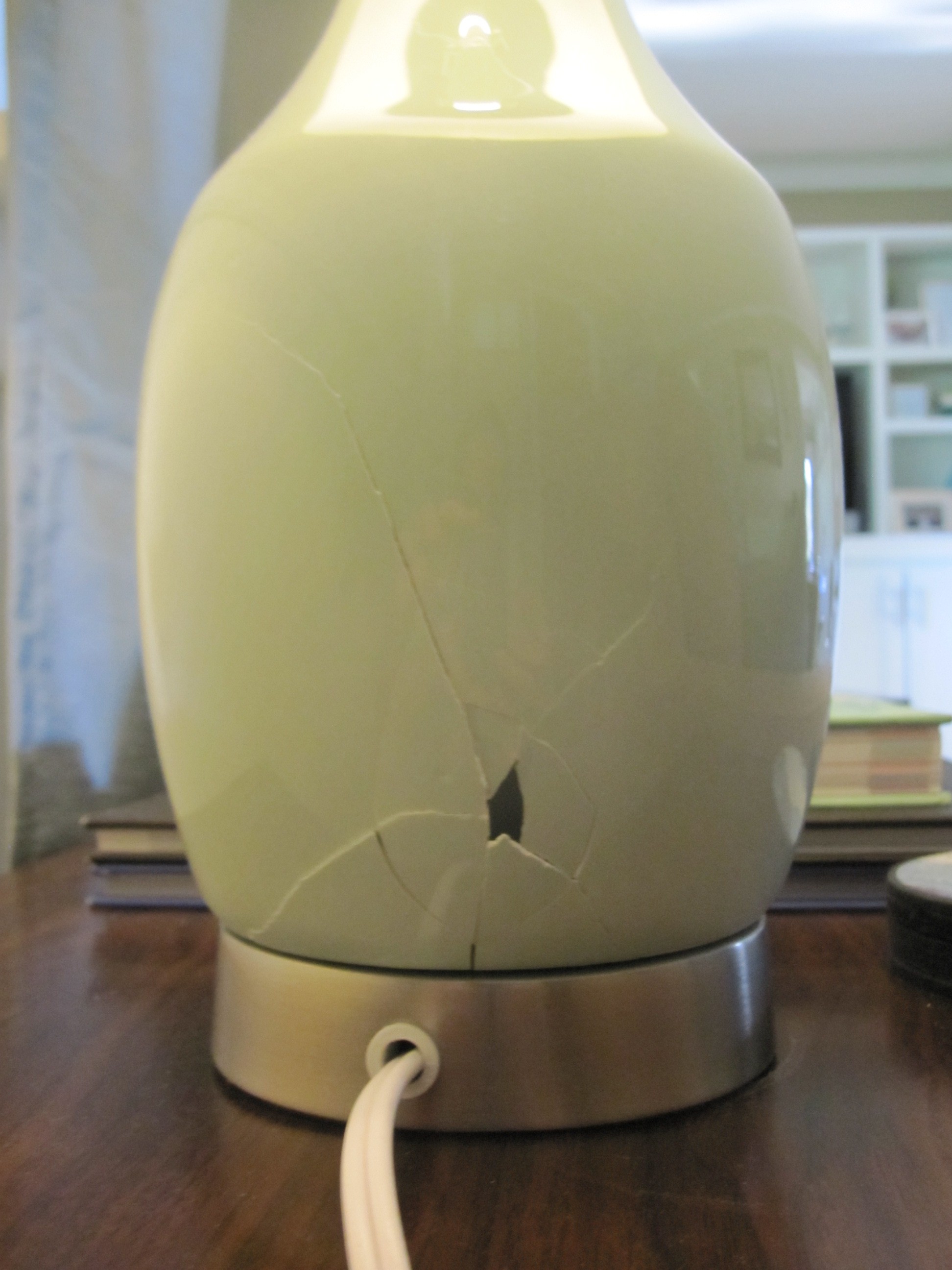 Our entire family was hanging out in our theater room on Sunday. It was a cooler evening, so we had the windows open. A storm was brewing, and it was pretty windy. We heard a thud. “What was that?”, I asked? “Probably a lamp.”, Ben said. I went upstairs to check it out. Sure enough, it was a lamp. It was so windy that the curtain blew up and knocked the lamp off the table. Fortunately, it wasn’t damaged, or so I thought. The shade was just fine and the top side of the lamp seemed okay, too. Then I put it on the table and saw this: