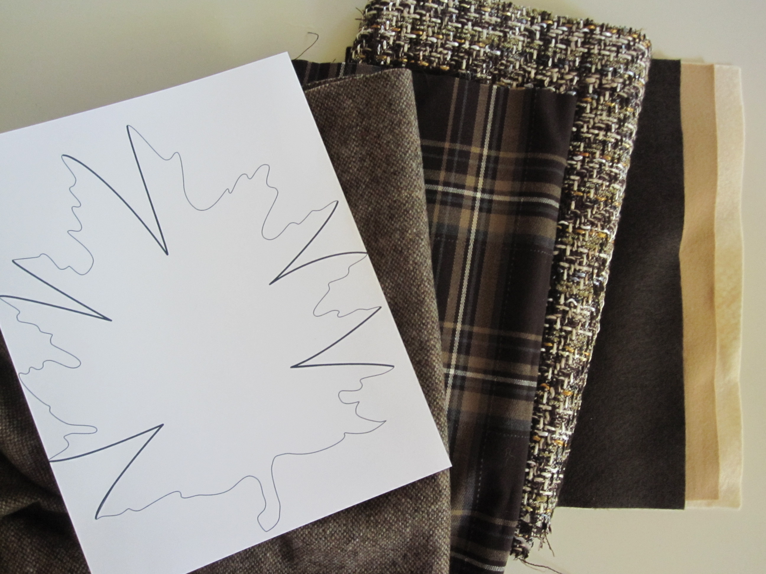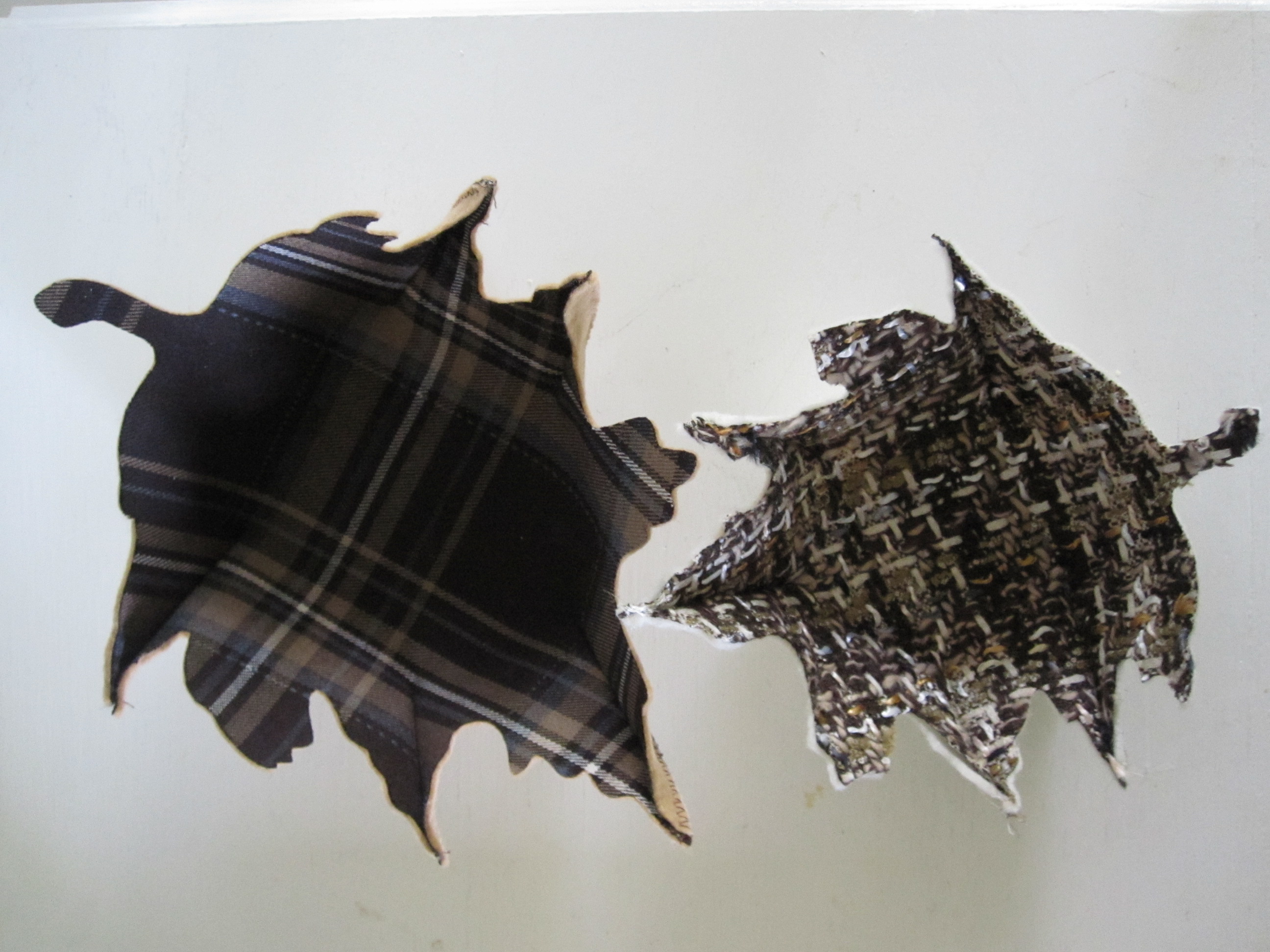 I followed Ms. Martha’s instructions, but here are a few photos to help you along.  First, place the interface rough side down on the wrong side (the back) of the tweed square.  Press for 5 to 10 seconds, move the iron to overlap slightly and press again.  Do this until your entire square is fused.  Then, trace the oak leaf pattern on the paper side of the interface.  You don’t have to be precise with the tracing.  You could even make your own leaf pattern, just add the darts.