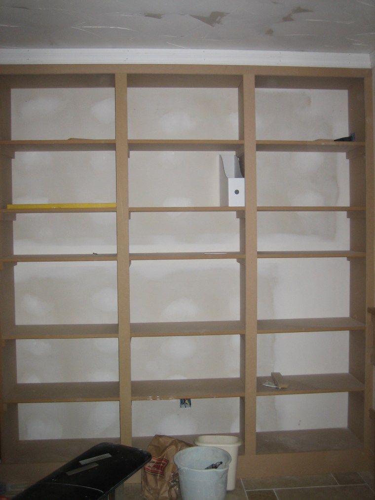 We (when I say ‘we’, I mean Ben) still need to build cabinet doors and drawers and add some finishing touches with accessories.  The bookshelf could be decorated with bright colors to add some pop to play off the neutral white and chocolate color scheme.