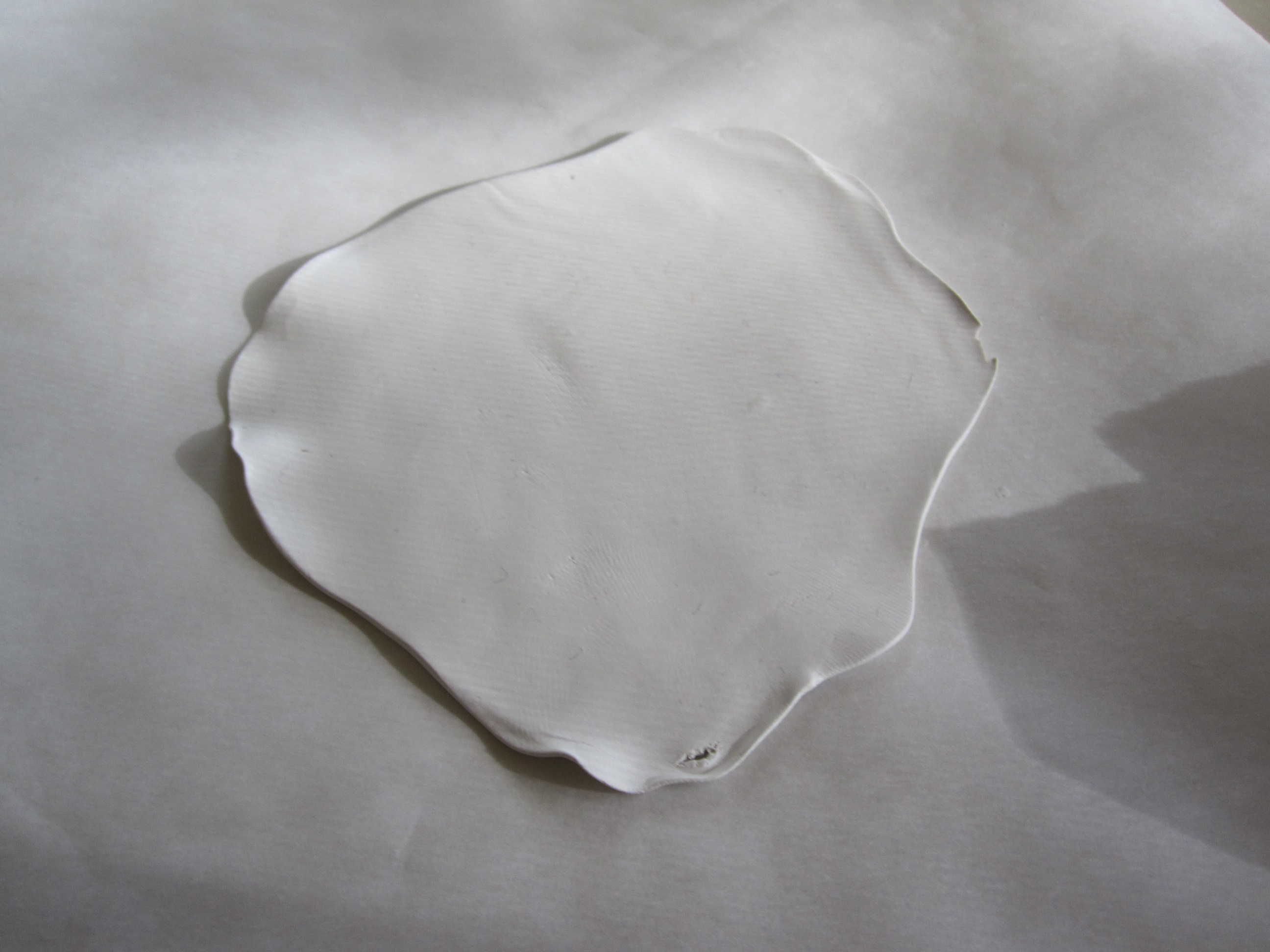 The size of the ball will depend on how big you want your flower to be, but you’re better off making it a little larger thank you think.  On a sheet of wax paper, use a rolling-pin to roll the clay out into a thin sheet.