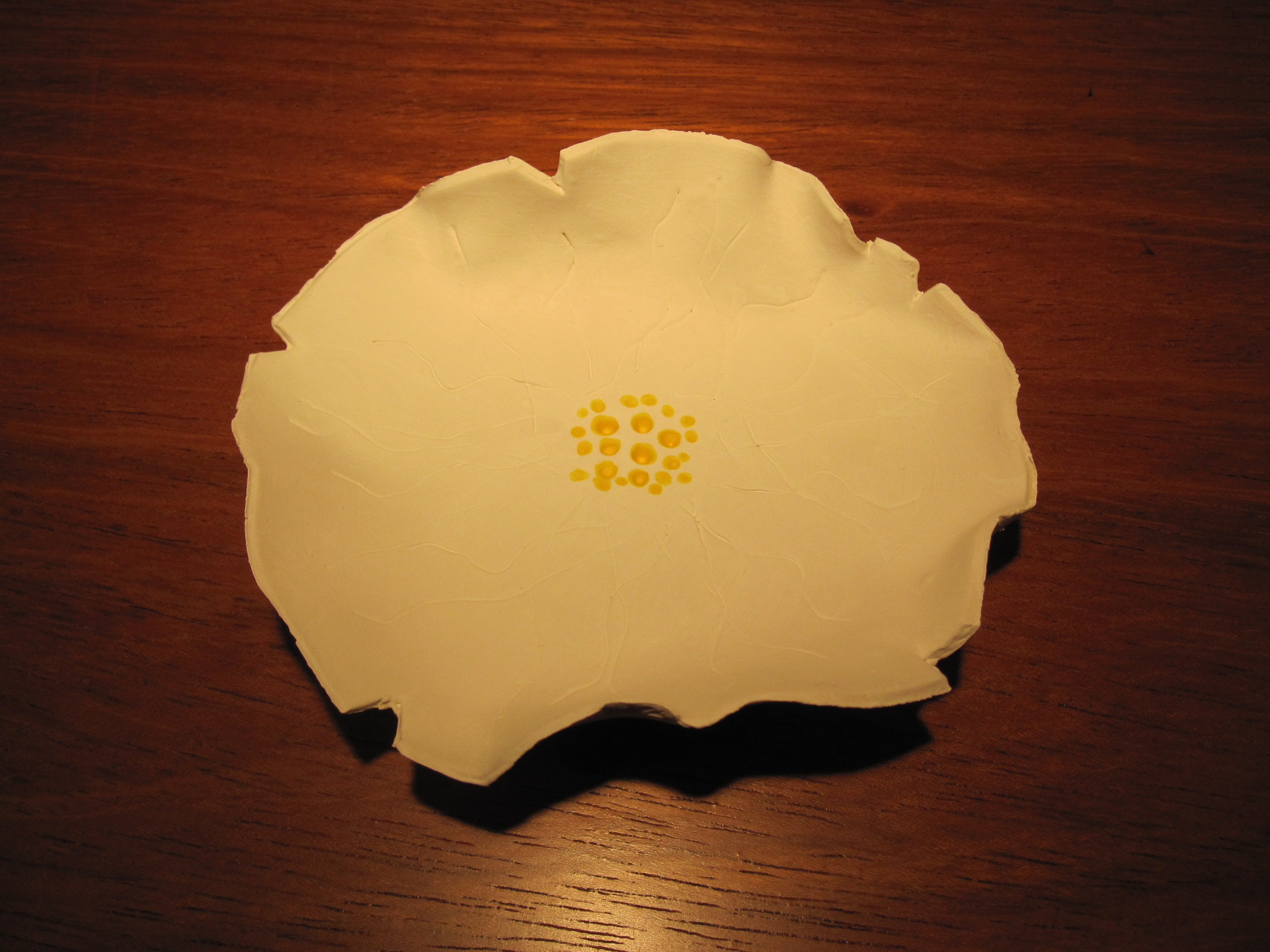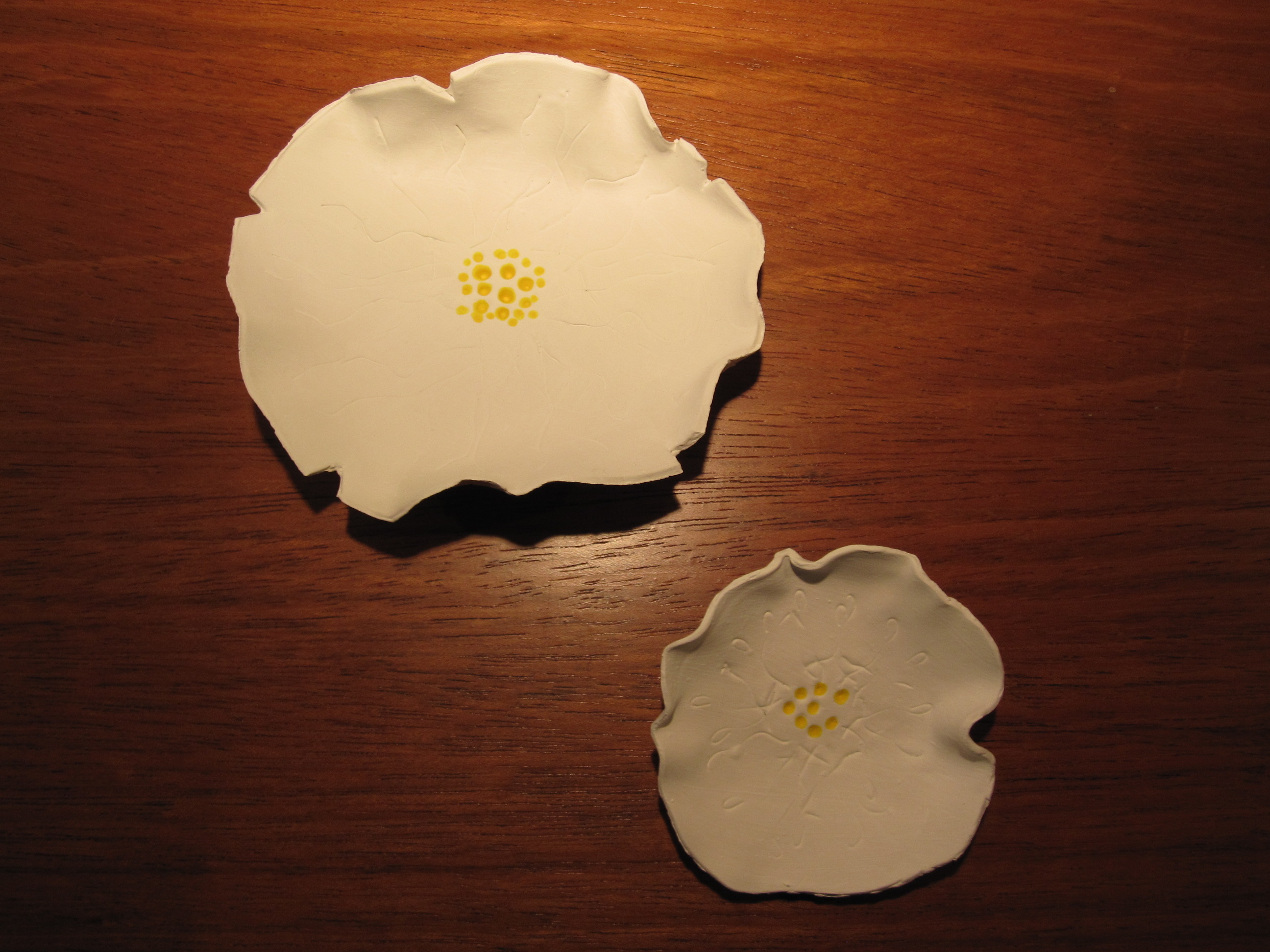 Remove from the oven and let the flowers cool.  Paint the fronts and backs the color(s) of your choice.  I painted the entire flower white and added sun yellow to the center dots, just for a pop of color.