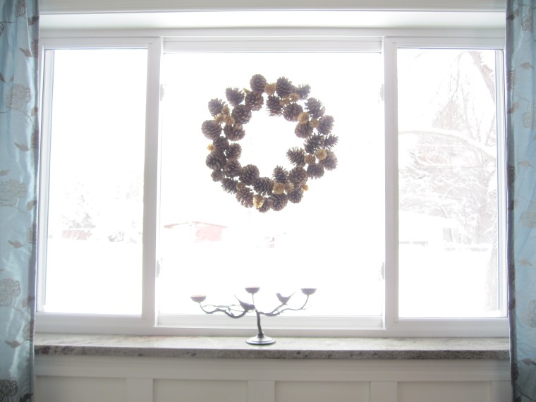 The way you choose to hang the wreath will depend on your situation.  You can add a few lengths of fishing line or hang from a hook.  You might be wondering why my wreath is on m dining room window.  Well, friends, that’s because it’s friggin’ freezing in Montana.  I literally have not left our house in days due to the cold.  Cold like a high of 5°.  Which means, the suction cup hook I bought won’t work on the outside of our front door.  It requires a minimum of 40° to stick.  So, it’s hanging in our dining room.