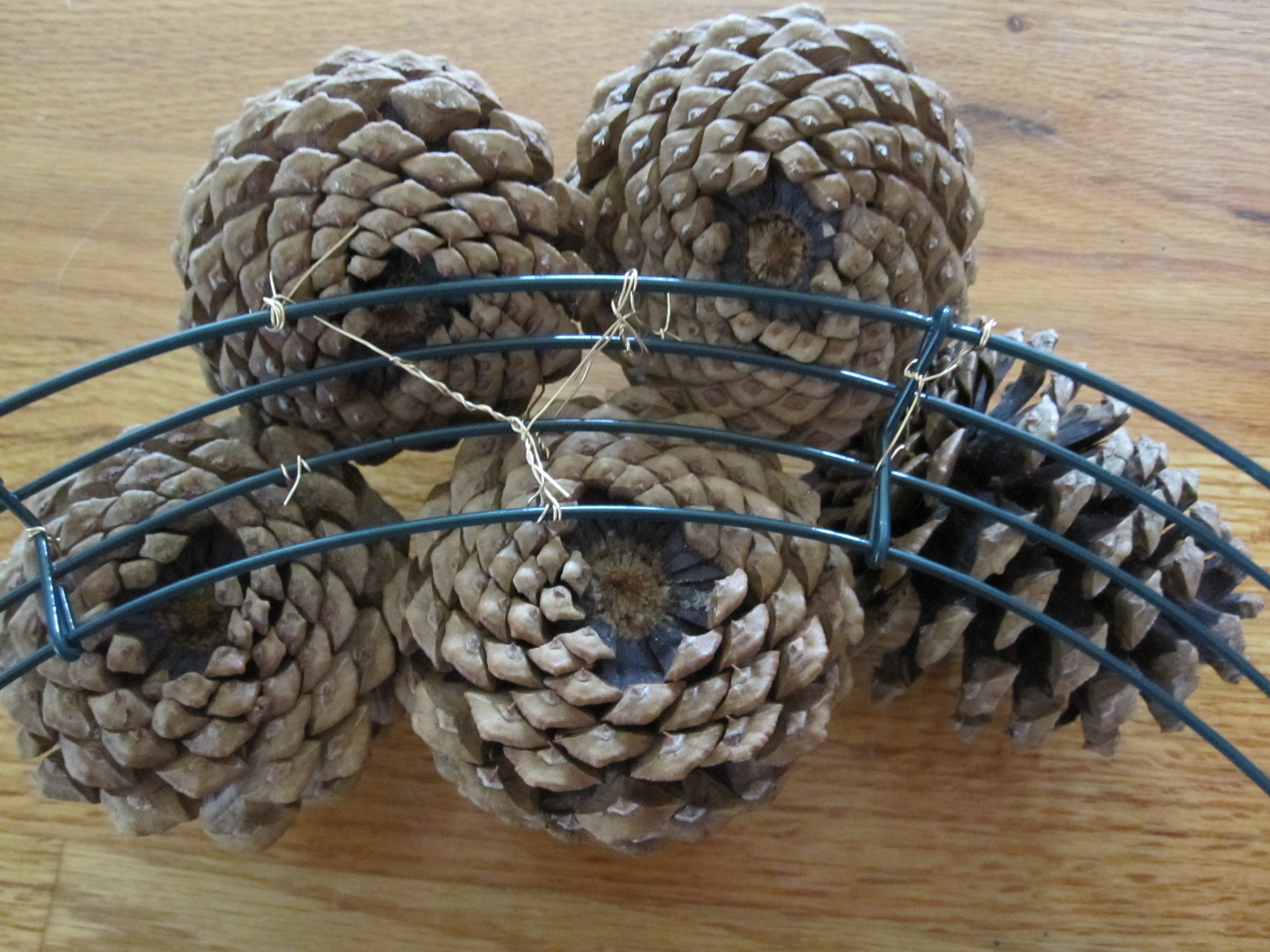 Once your cone is wired, wrap around the wreath form, pulling tightly to keep it firmly in place.  Wrap the wires of the next cone to the previous wiring.  Again, this will keep the pinecones in a tight formation and prevent flopping.