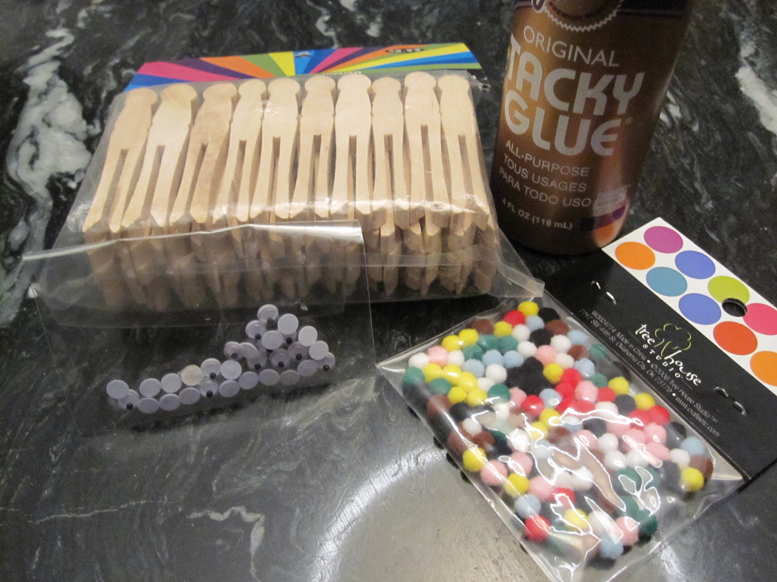Here’s a Christmas craft project that is great to get the kids involved in. To start, you’ll need a package of clothespins, all purpose glue, small oogly eyes, mini pom poms and thin ribbon.
