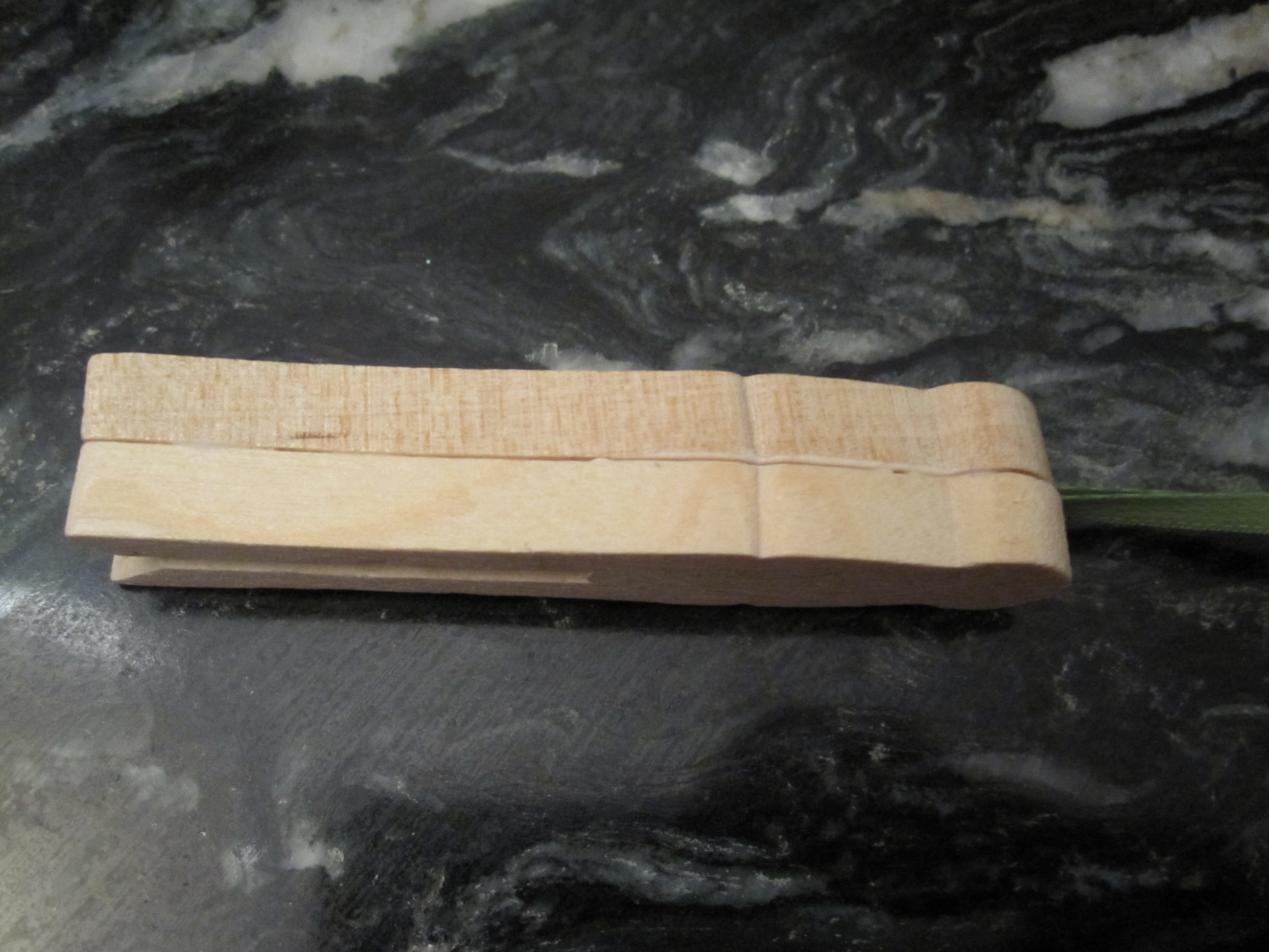 To make the reindeer ornaments, start by gluing two clothespins together with a loop of ribbon between. These two clothespins make the legs.