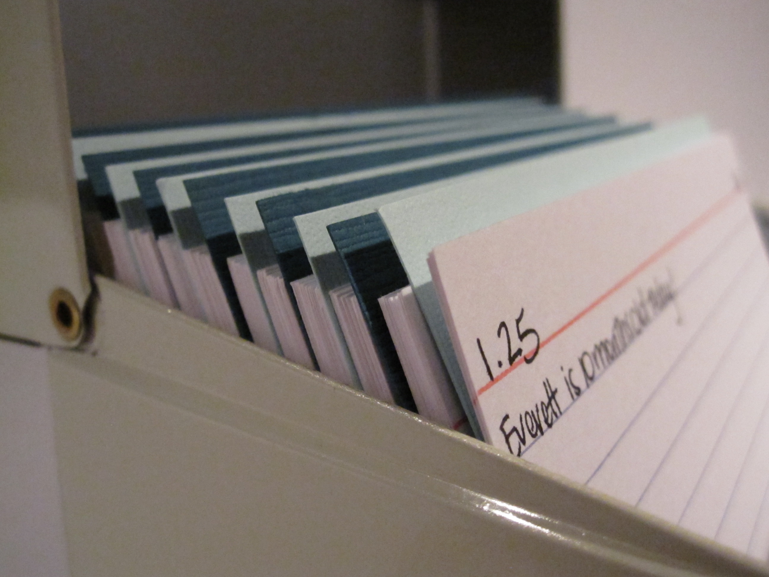 After I numbered each card, I used two colors of cardstock, also already owned, to cut dividers for each month.  I made each divider 5 inches wide by 3 1/4 inches tall so I could easily see the dividers above the notecards.