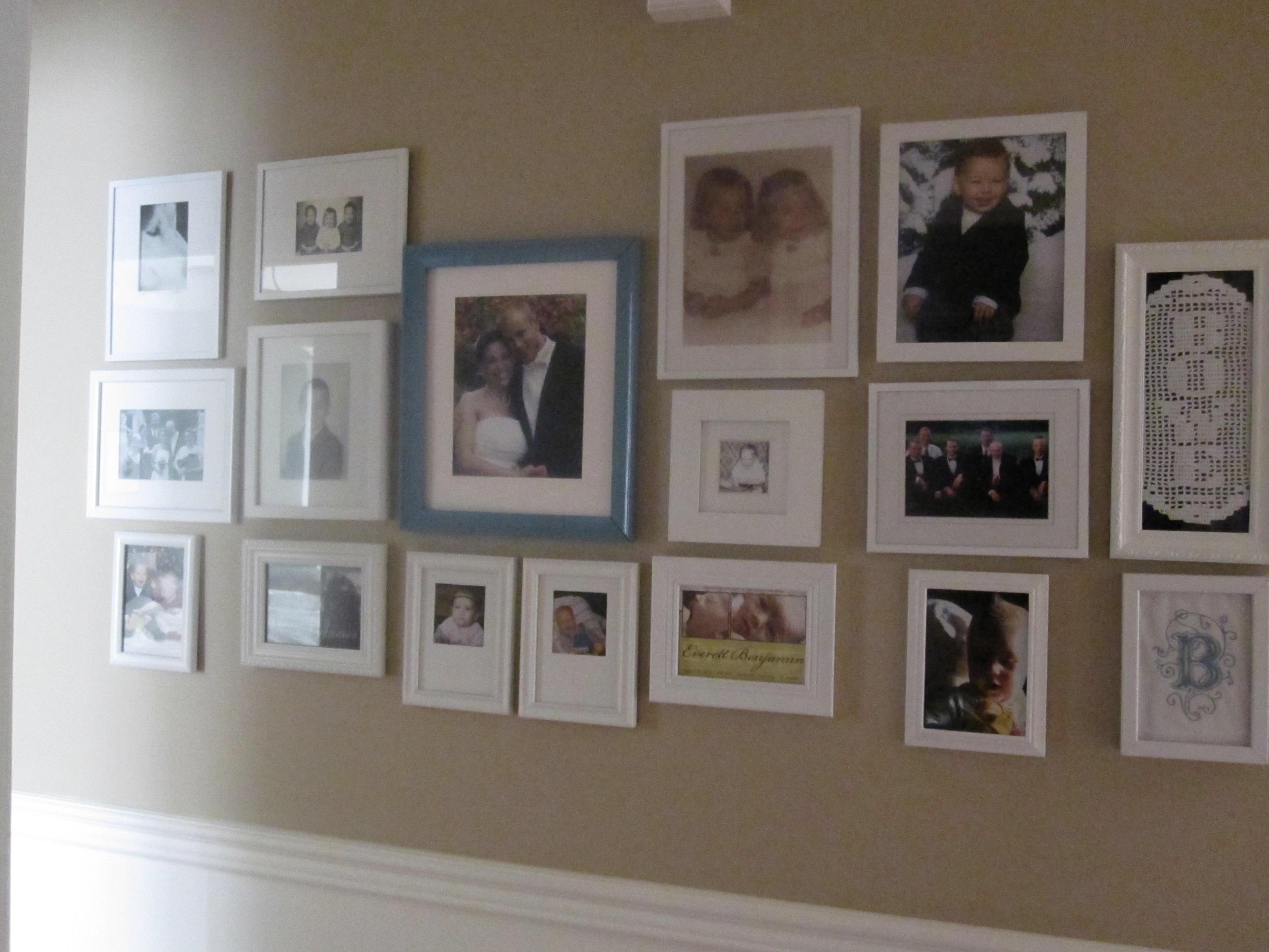 The layout isn’t drastically different, but pay attention to the bottom row of frames.  What was Martha’s tip?  Keep everything above and below a line of painters tape.