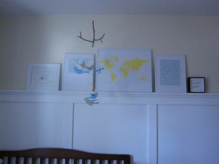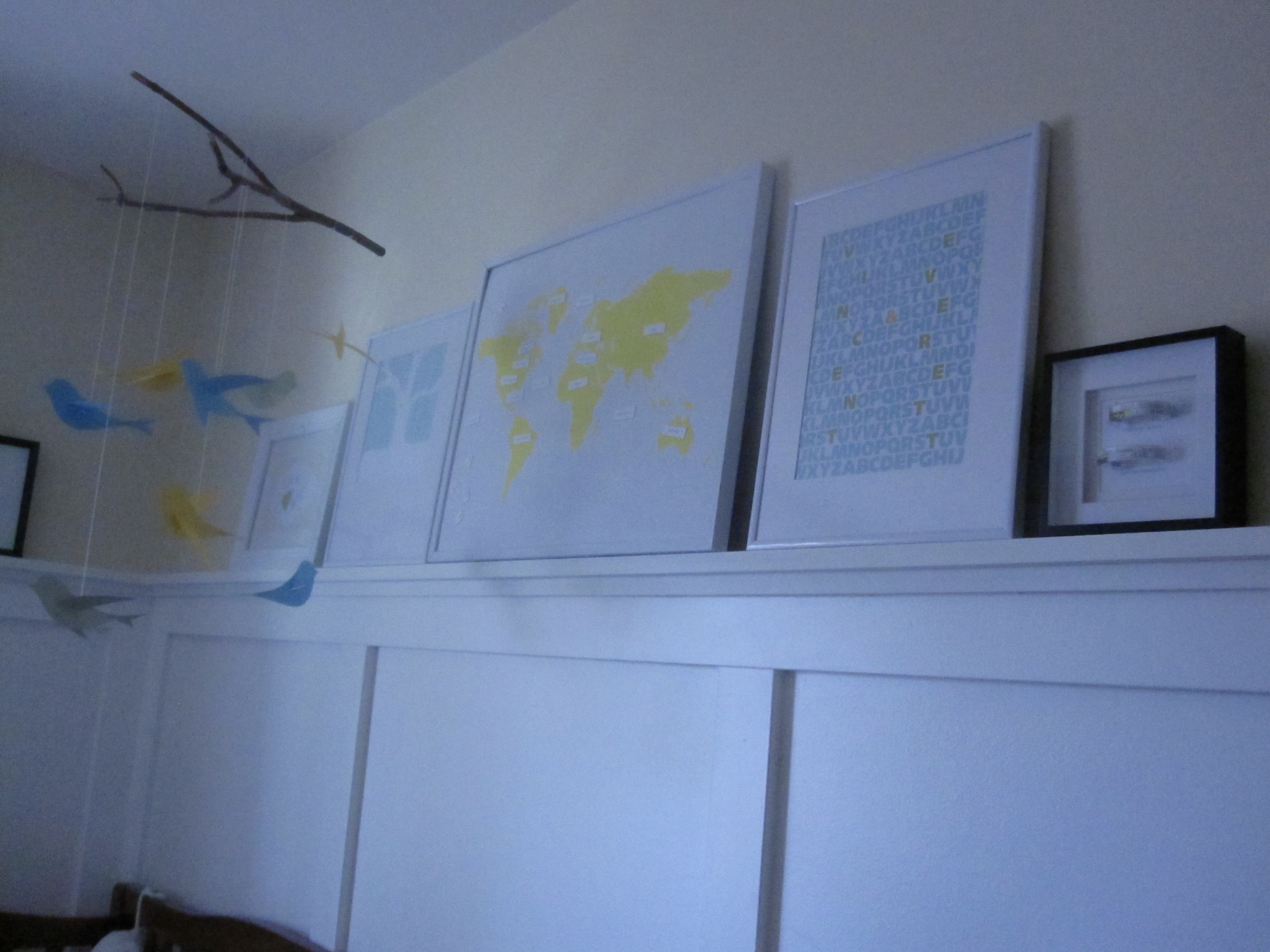 When we’re not playing, the map takes center stage on the art wall, right next to the customized Made by Girl alphabet print and our free Valentine’s day All You Need is Love printable.  If you’re afraid this is going to fall on Everett, don’t fear.  I placed a few dots of sticky tack behind each corner to keep it firmly in place.  Just a few more framed prints and this wall is done…for now.