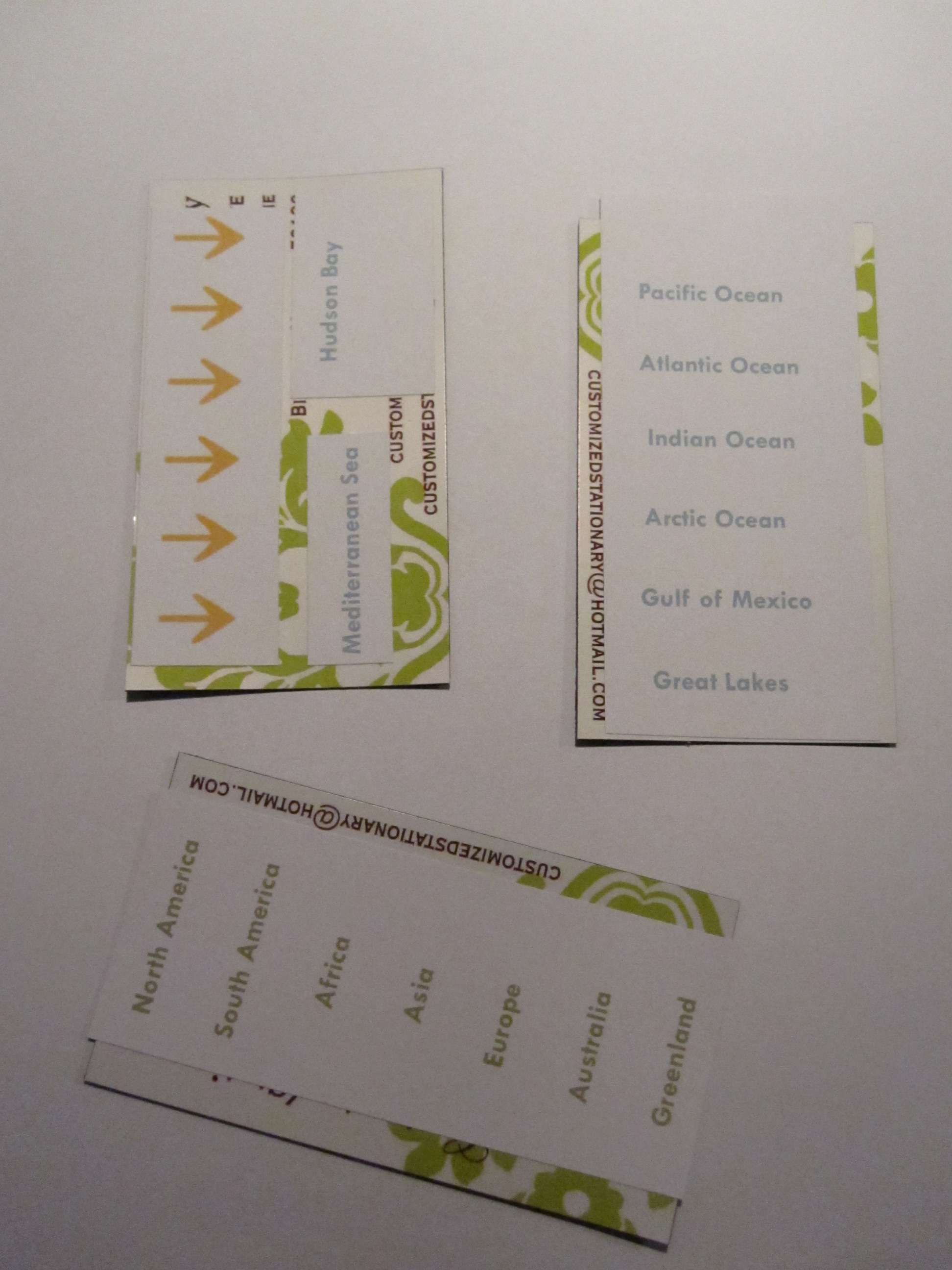 Type out the continents, oceans and other large landmarks, (for my size map, I need equally small magnets, so I used 10 point font).  I also created a few arrows.  Then, print onto stickers, remove the backing to place on your magnet and cut to size.