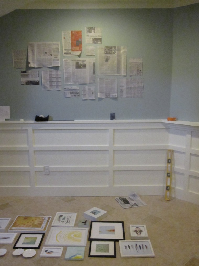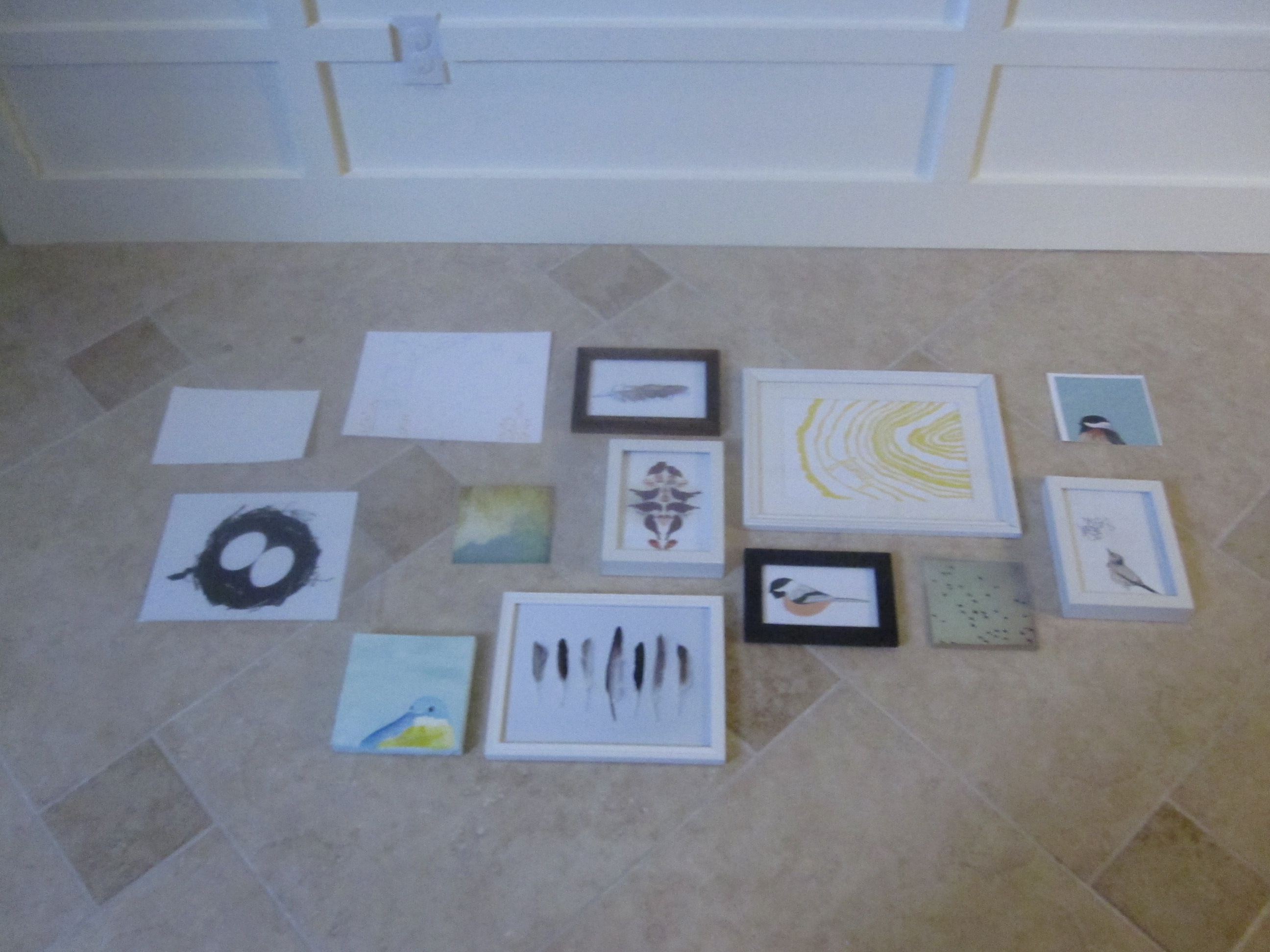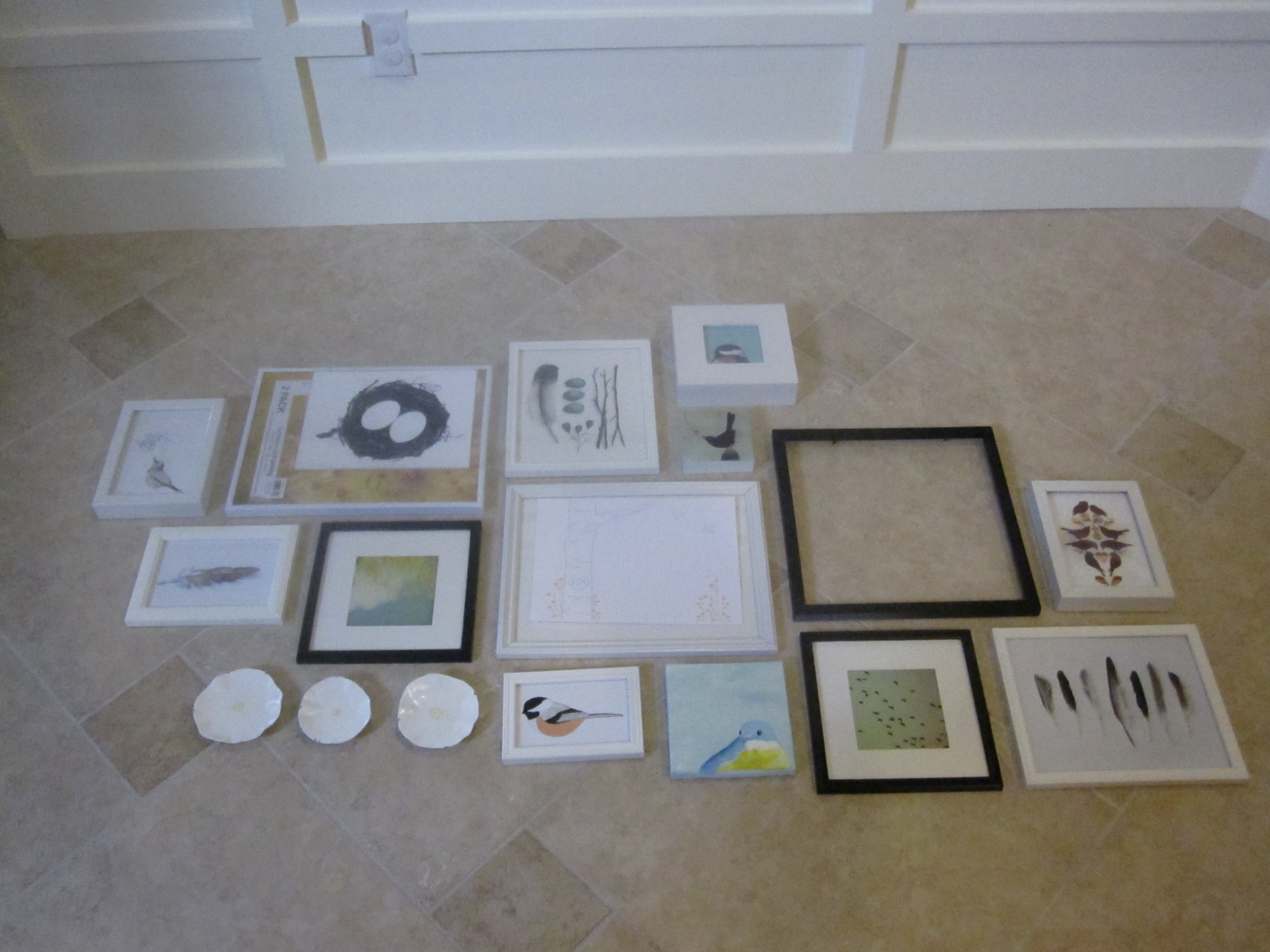 Gallery walls are all the rage right now.  We already have one in our main level hallwayI’ve been scouring Etsy lately to find the perfect art to fill a gallery wall in our basement.  I’ve finally found enough art to fill the wall.  Now, I’m fiddling with the arrangement.  Something asymmetrical containing all my bird, feather and tree art.  To find the perfect arrangement, I started moving the frames around on the floor in front of the wall.  One layout I liked, the other I loved.
