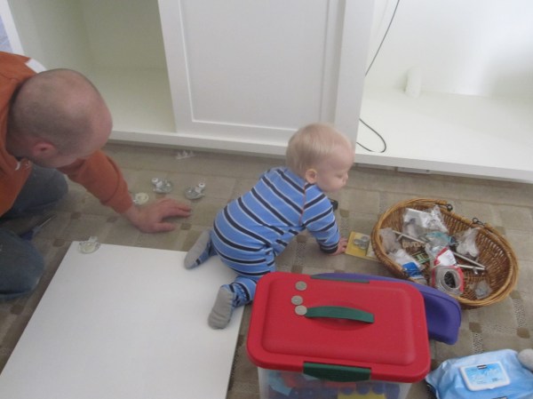 The cabinets quickly became a fort and Vincent had so much fun surprising Everett.