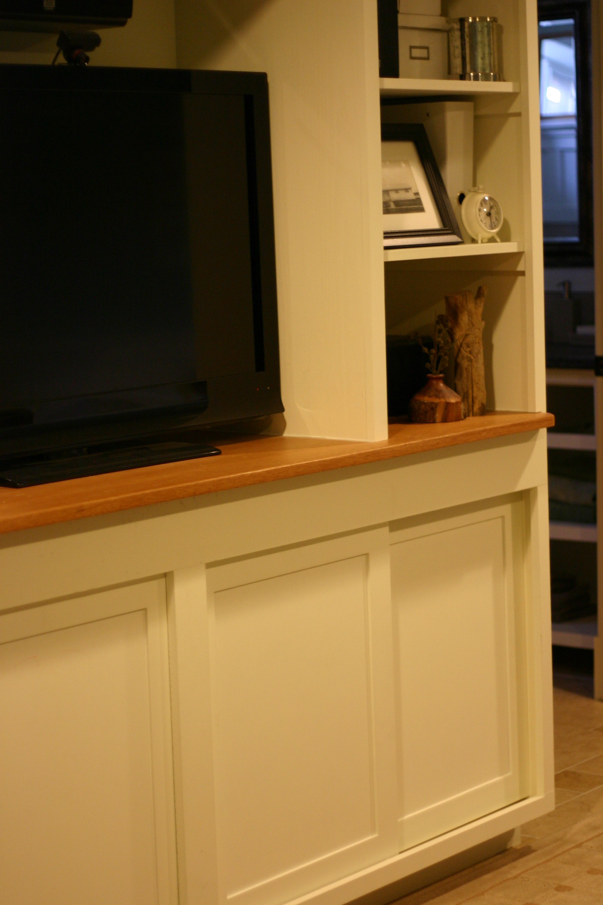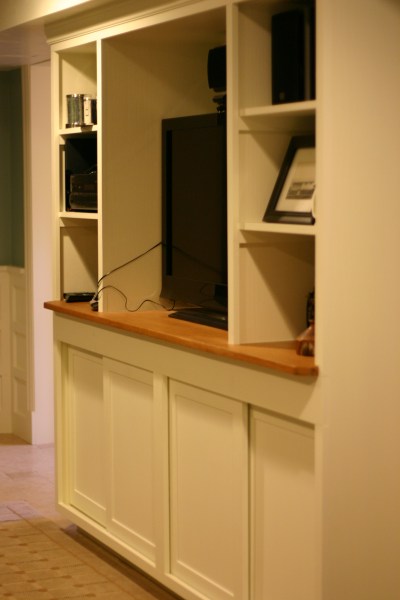 Or, our newly installed cabinet doors in the theater room.  Our nearly finished basement has been just that, nearly finished, for over a year.  A few drawers, drawer fronts and cabinet doors remained.  Last summer, Ben had built the cabinet doors for my office and the theater room entertainment center.  Then, the doors stayed in the garage, unprimed and unpainted for, umm, roughly nine months.  Why does building and finishing cabinet doors take longer than building a baby?  For some reason, we never pushed to complete these tasks.  Until recently.  Over the weekend, we hung the cabinet doors, say it with me, “Finally!”  That’s right, folks.  The entertainment center is nearly finished.