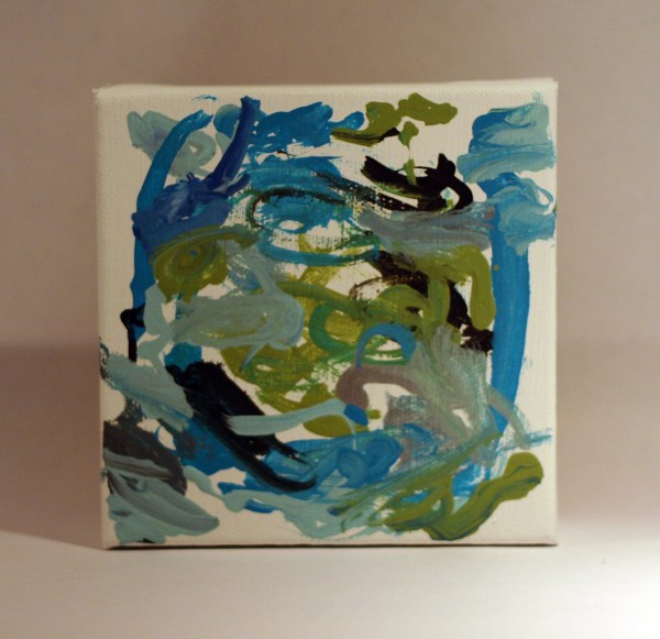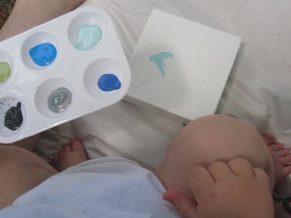 Do you see the light hand print behind?  That’s why you need more paint.  If you mess up, while the paint is still wet, you can wipe it away with a damp cloth to start over again.  I was distracted, so I didn’t get to.  With Vincent’s painting drying, I started on Everett.  I squeezed a glob of paint to his hand and immediately, he clenched his hand shut and oozed paint through his fingers.  That got a chuckle.  After unclamping his hand, I spread the paint over and brought the canvas to him.  Hand placed perfectly, then he yanked it away, dragging across the canvas.  Time for plan B.  I wiped the wet paint away and decided on an abstract painting from Ev.  I picked our palette.