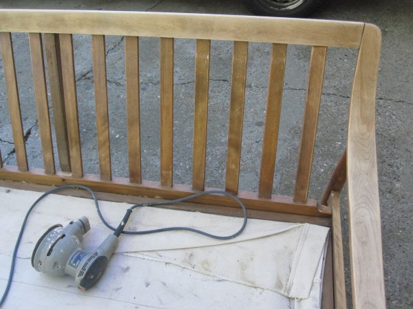 Of course sanding had to happen before I could do anything else. It’s gotta get worse before it can get better, right? I used an orbital sander with 220 grit paper to sand all of the flat surfaces. If you’ve never sanded something and have concerns, use a high grit paper (this will prevent removing anything too quickly) on a hidden area until you get a feel for it. I started with the arms and the top rail.