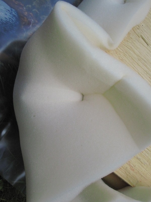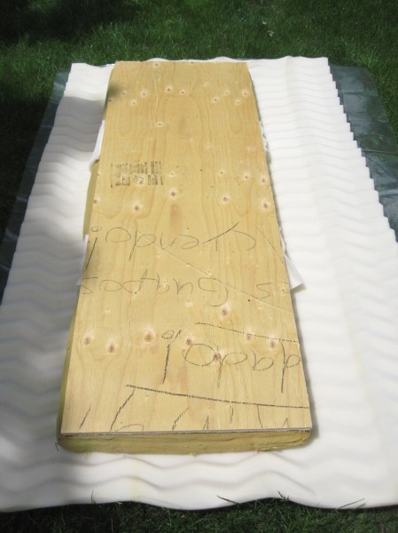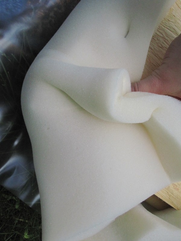Followed by another layer of foam. I placed the foam smooth side down, with the cushion covered plywood on top.