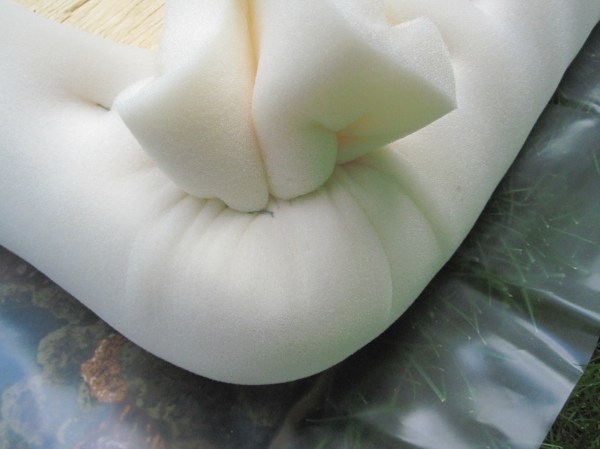 Starting on the long sides, I stapled the foam at the center. Then, pulled the other side tight and stapled again. I stapled the entire length and then started on the corners. For a straight, smooth corner, I pulled the foam tight.