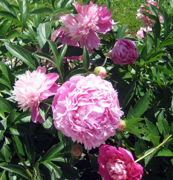 Mature peony plants in full bloom and other small flowering plants add splashes of pink.