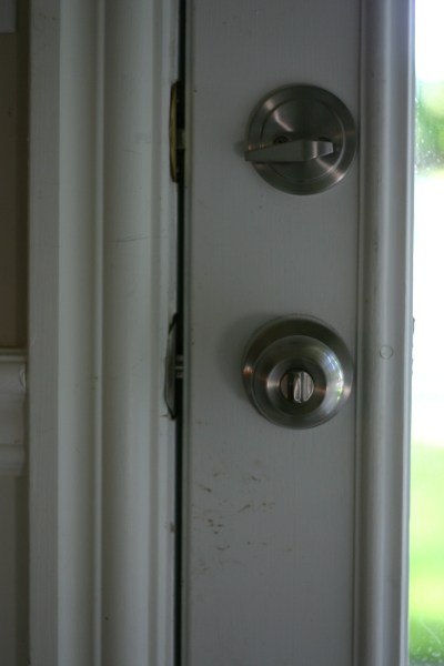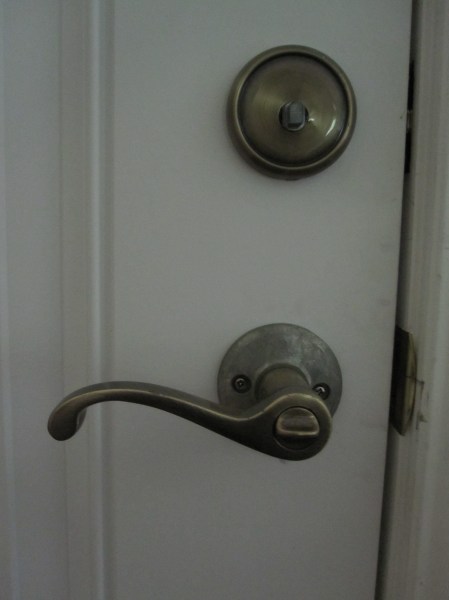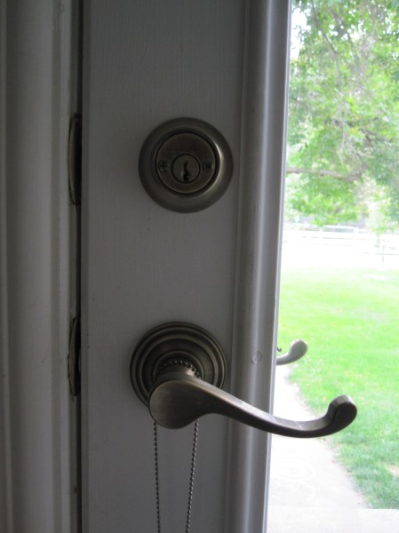 Ben bought the front door hardware when he bought the house. When we bought matching hardware for the backdoor, we couldn’t find the same style deadbolt. All we found was a lever handle with a deadbolt which locked from both sides. Locked from both sides! Why? That meant we had to hang a key from the backdoor just to open it!