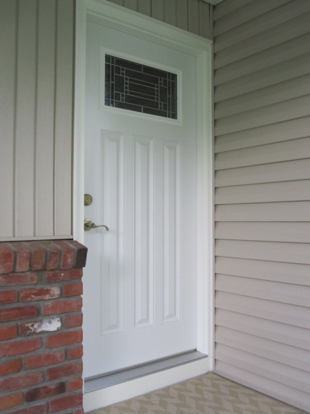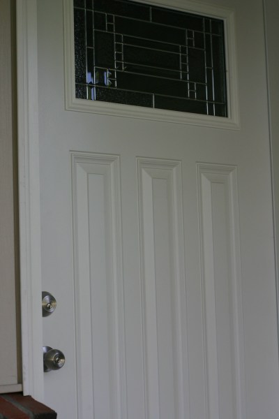 Not pretty. Or finished. So, I busted out the gallon of satin white exterior paint leftover from painting the mailbox post. Three coats later, our trim looked satin shiny and new. But the antique brass lever handle just wasn’t cutting it anymore.