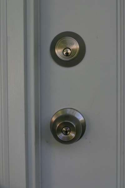 Umm, yeah. If our kid kleptos the deadbolt cover, you can bet your bottom dollar that he stole the key all. the. time. And, the front and back door keys were different. So we didn’t replace strictly for cosmetic reasons. We chose a brushed stainless knob and deadbolt set for both doors. And, they are keyed to match. Score.