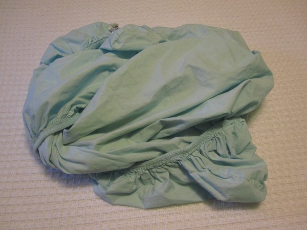 So, this is by far the most earth-shattering post to date.  Not really, though.  Only my fellow OCD geeks will think it’s the coolest thing since sliced bread.  Today, kids, we will learn how to fold a fitted sheet!  See, I told you it was earth-shattering.  As in any class, some of you will already know how to do this, but for the rest of you, read carefully.  In today’s lesson, we’ll learn how to go from this: