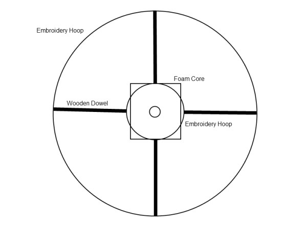 What, that didn’t make perfect sense to you? Let me explain. The outer circle is the top embroidery hoop of the shade you just finished. The medium-sized circle is the tiny embroidery hoop which will keep the fixture hanging. The four thick lines are 1/4 inch wooden dowel, epoxied to the pendant shade and the small hoop. Don’t use hot glue for this, you want it to be completely secure. The square is foam core with a small hole cut in the center. Place the foam under the small embroidery hoop with the wiring threaded through the hole.