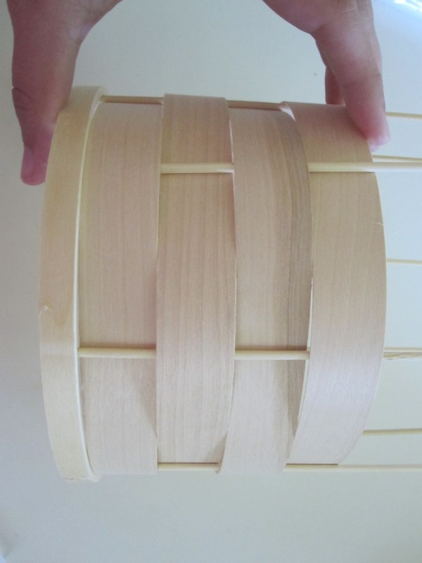 We still have more than half a roll of the veneer strips, so I brainstormed ways to use it. One of my ideas was another light fixture. I know, how many wooden light fixtures does one house need? This one isn’t for our home, actually. When I was in Minnesota visiting my blog BFF Jen, she mentioned she wanted a new light fixture for her son, Preston’s, room. That’s when I shared my diabolical plan for a wood veneer/embroidery hoop/bamboo skewer drum shade. And, she loved it. Now, I had to figure out a way to, as Project Runway’s Tim Gunn would say, “Make it work!”