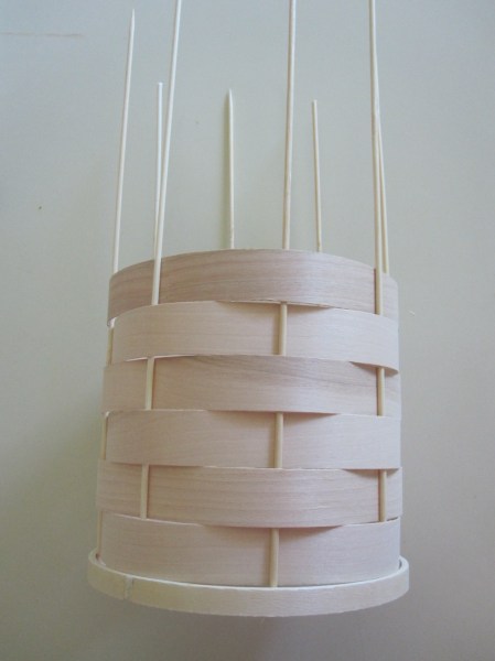 If you don’t want to use embroidery hoops and dowels, track down a wire lamp shade cage and weave veneer around it. You could use something like this for the top and this for the bottom. A heavy gauge wire would work to make the verticals for the weave. I would spray paint these before weaving the design, just to modernize the brass look, for around $10.00, which isn’t bad for a 24 inch diameter pendant.