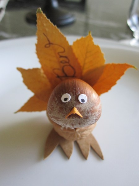 Use nuts, dried leaves and hot glue to create turkey place cards. Cute enough to use throughout the fall, not just Thanksgiving.