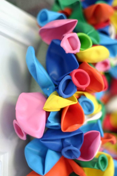 Five bags of balloons from the Dollar Tree plus a foam wreath form I already had plus a box of straight pins equals an adorably cheap, festive wreath, perfect for a birthday party.