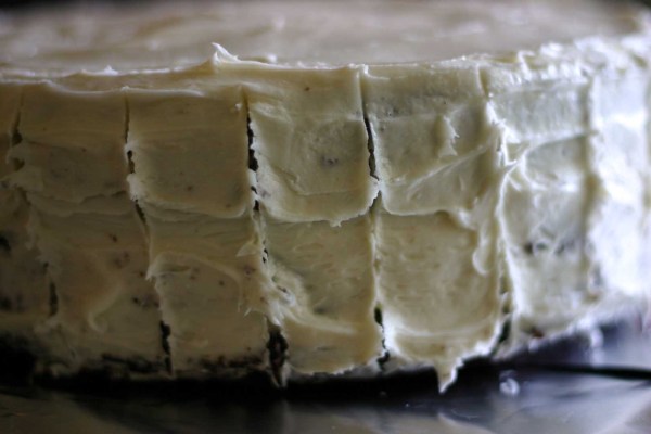 I don’t bake, so I decided to buy a box of cake mix (Betty Crocker Chocolate Fudge, to be exact).  I poured the batter in 9 inch spring for pan, and it barely covered the bottom.  So, I mixed up another box to make two layers.  To assemble the cake, I cut the tops off for a flat surface.  Then, I melted Nutella to spread as a layer between the two cakes.  My sister frosted the cake with cream cheese frosting.  To decorate, we added stripes of M & M’s.  First, we made lines using the back of a knife, just to keep everything straight and even.