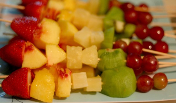 The fruit skewers consisted of one strawberry, two peach slices, two pineapple chunks, one large piece of kiwi, and two grapes.  We forgot to get blueberries.  Oops.
