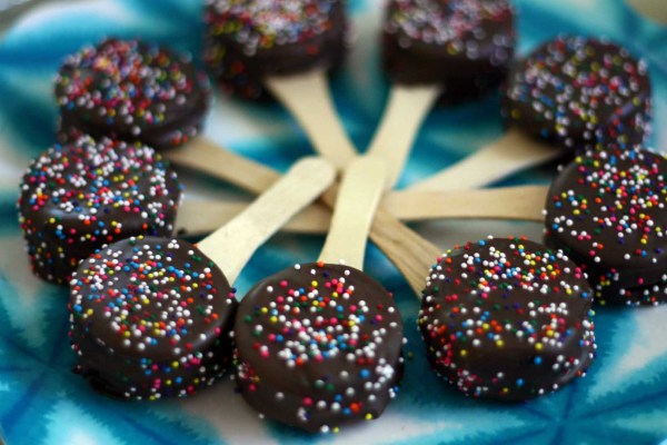For dessert, I made Oreo pops and a chocolate cake.  For the Oreo pops, we used Oreo Triple Double cookies.  I had small wooden spoons left over from another craft project, so I used those for the sticks.  A quick dip in almond bark and a shake of sprinkles later, we had a cute dessert.
