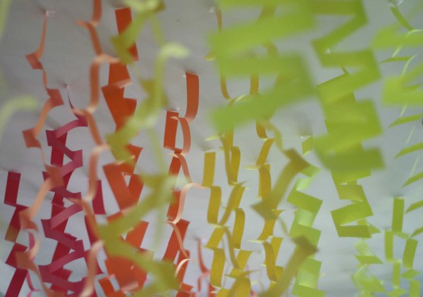 1. Aww, thanks, Jen! The streamers were actually really easy and pretty quick. I just cut 8.5 by 11 sheets of construction paper in half vertically. Then, cut a strip parallel to the short end, leaving about 1/2 inch from the end. Double the width of that first row (the wider it is, the shorter your streamer will be) and cut the rest of the way. Then, flip the paper around and cut between the others, again not going completely through. We did about 8 sheets of each color to cover our dining room ceiling. When we were done with the party, we pulled them down and folded them up for another party. The cool thing is these would look cool in any color scheme, too. Love it!