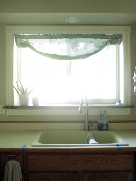 Because we’re turning the drawers on either side of the stove into one large bay of drawers, we can’t keep the trash in it’s current location.  Here’s what it would look like to center the sink on the window.