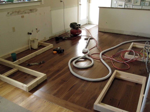 With the floor done, we started installing the cabinets Thursday morning. Because we’re washing dishes in the bathroom sink, getting a sink was a pressing matter. Rather than incorporating the toe kick in the cabinet, we cheat and build separate toe kicks. Two by fours are the perfect height and they’re durable, so Ben makes boxes three inches smaller than the overall cabinet size.