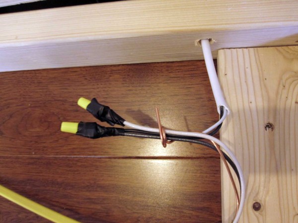Wires for what? Ben’s awesome idea. Under cabinet lighting. And not the halogen task lighting. Rope lighting under the toe kicks. A similar idea to the crown molding accent lighting in our master bedroom. We’ve had several people ask how to do this. I’m no electrician, so don’t quote me here, but Ben starts with a piece of rope light with a plug-in end. He cuts the plug off and strips the wires. Then it’s just a matter of connecting the proper wires to one another and capping everything off with wire nuts and electrical tape.