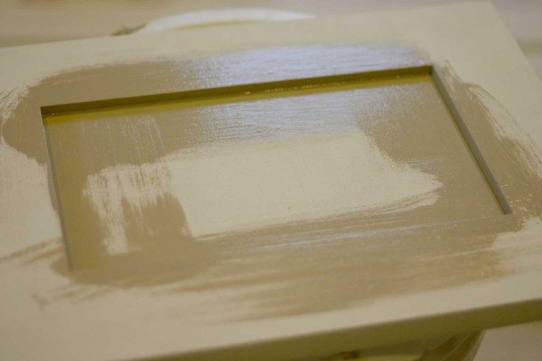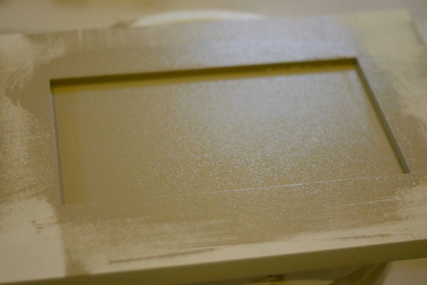 Then, before loading your roller with paint, quickly go over the brush strokes on the raised areas.  Now dip your roller in paint and roll it around on your paint tray to get it evenly coated, but only lightly.  Roll the inside panel, getting as close to the edge as possible.