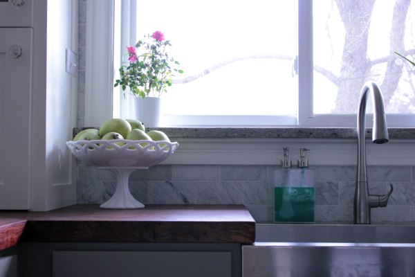 Amanda, don’t you just love how the colors are popping against the gray and white in your new kitchen. I love the pink of your roses with the marble. Sweet! Also, the green apples look good, too.