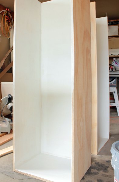 I hoped Ben would put them on the entertainment center if they were sitting in the living room, but they are about 1/4 inch too tall. We’ll have to bring them down to the garage, cut each down a little, then carry the cabinets back up.