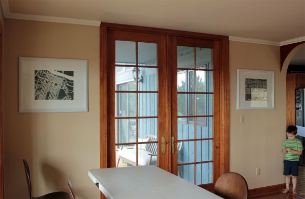Personal art is something I love having in my home and something I really enjoy making. Last year, I made a cut out map of Savannah, Georgia, where Ben and I honeymooned. Patricia from PVE and I traded art, and she requested a map cut out of New York. Well, I’m at it again, this time with our home town. It started when I decided to clear some of our junk from the basement. After hanging the Savannah cut out in the living room, I looked around at our bare walls. Specifically, these matching bare walls on either side of the dining room doors.