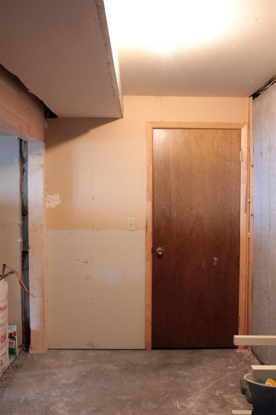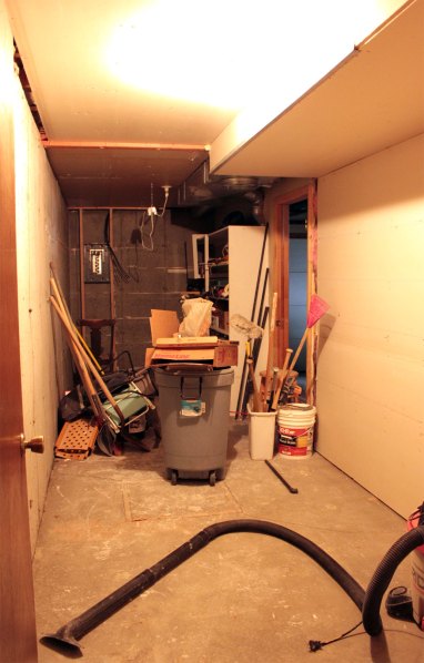 Here’s the thing, our garage is roughly two and 3/4 stalls wide, with only two garage doors.  The 3/4 part was separated into two storage rooms, one accessible from the garage, the other from the utility room.  Because we’ve got two cars and a boat to park, we decided we could live without the storage rooms.  So Ben tore out the separating wall and the sheet rock to prepare for the change.