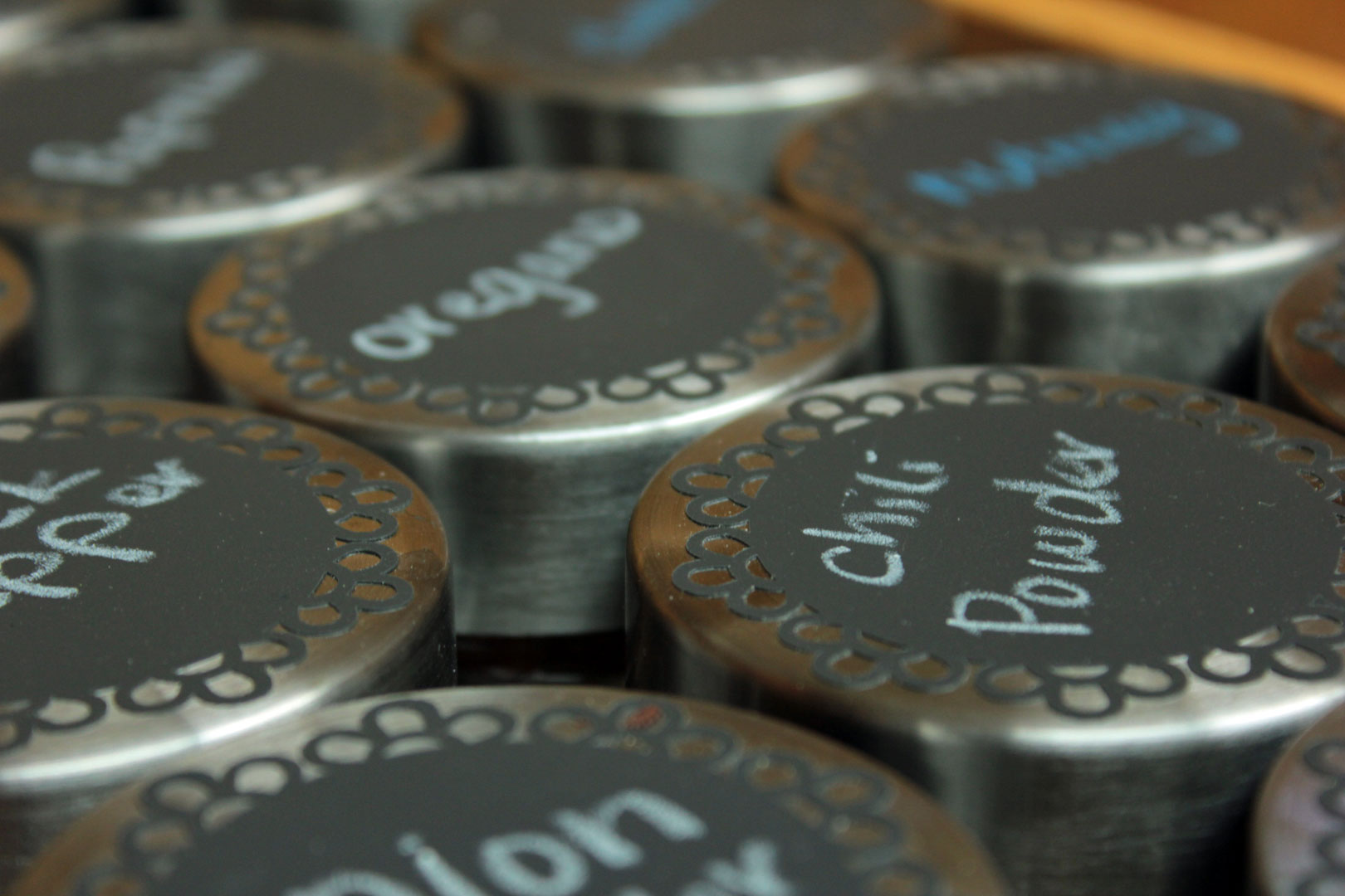 I love having a spice drawer instead of a cabinet. I bought jars at Hobby Lobby (in the glass section) at 50% off for a buck. I gave Jen the size and she used her Silhouette to make the labels. I know you can find sticky chalkboard labels on Etsy too so take a look there. And, the crayons work really well.