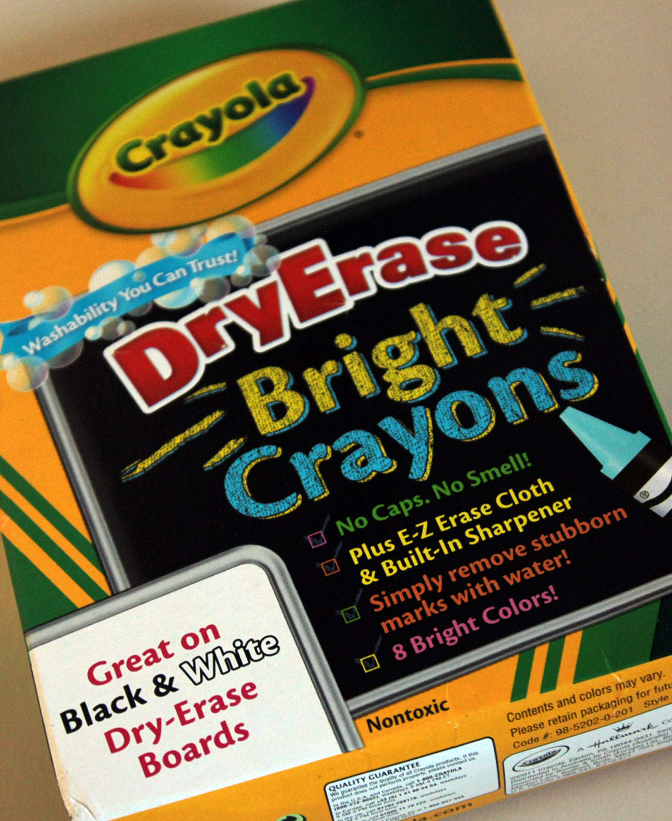 So I peeled those puppies off the sheets and stuck ’em to my spice jars. Then they sat that way while I tracked down a chalk pen. Well, tried. After stopping at four different stores, all rumored to have said chalk pens, I gave up. Instead, I bought dry erase crayons, hoping they’d work.
