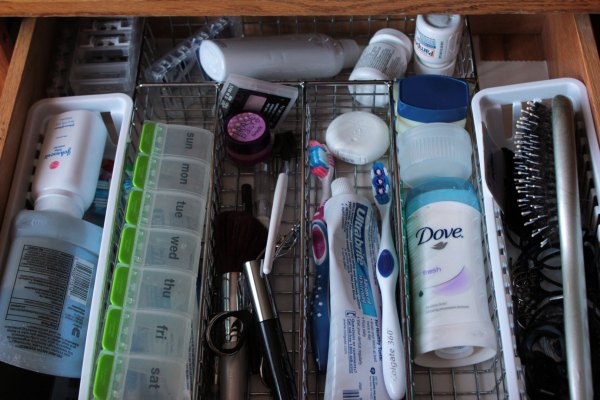 Another quick drawerganization started at the thrift store. I spotted a chrome silverware divider for a buck ninety-nine. When I see cheap organizers, I try to find a use for it. Then it hit me, organize the friggin’ bathroom! At home, I plopped our toiletries, vitamins, toothbrushes, and toothpaste in there and it made me smile. Sure, it’s nothing fancy or super pretty, but we can fin what we’re looking for. That’s all that matters, right?