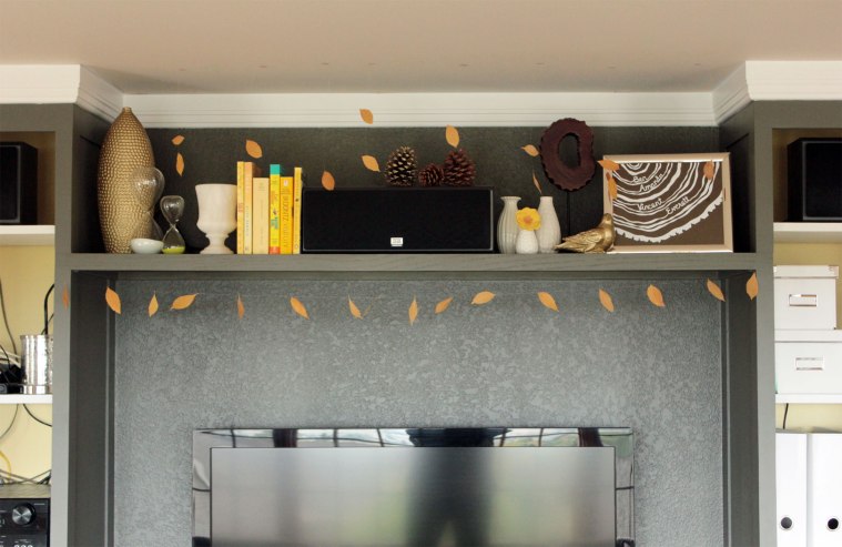 Sometimes I wish I planned ahead more and decorated for various holiday and seasons.  Nothing that would look like I bought an entire aisle at Hobby Lobby, but more than the few areas I do decorate.  Because so much is unfinished (or even started) in this house, my focus has been more on necessary projects, not decorating.  And we’ve only got a few logical places for decor at the moment.  I’ve already fall-ified the couch.  Without a mantle, I use our entertainment center as a substitute.  So, here’s our little dose of fall decor.